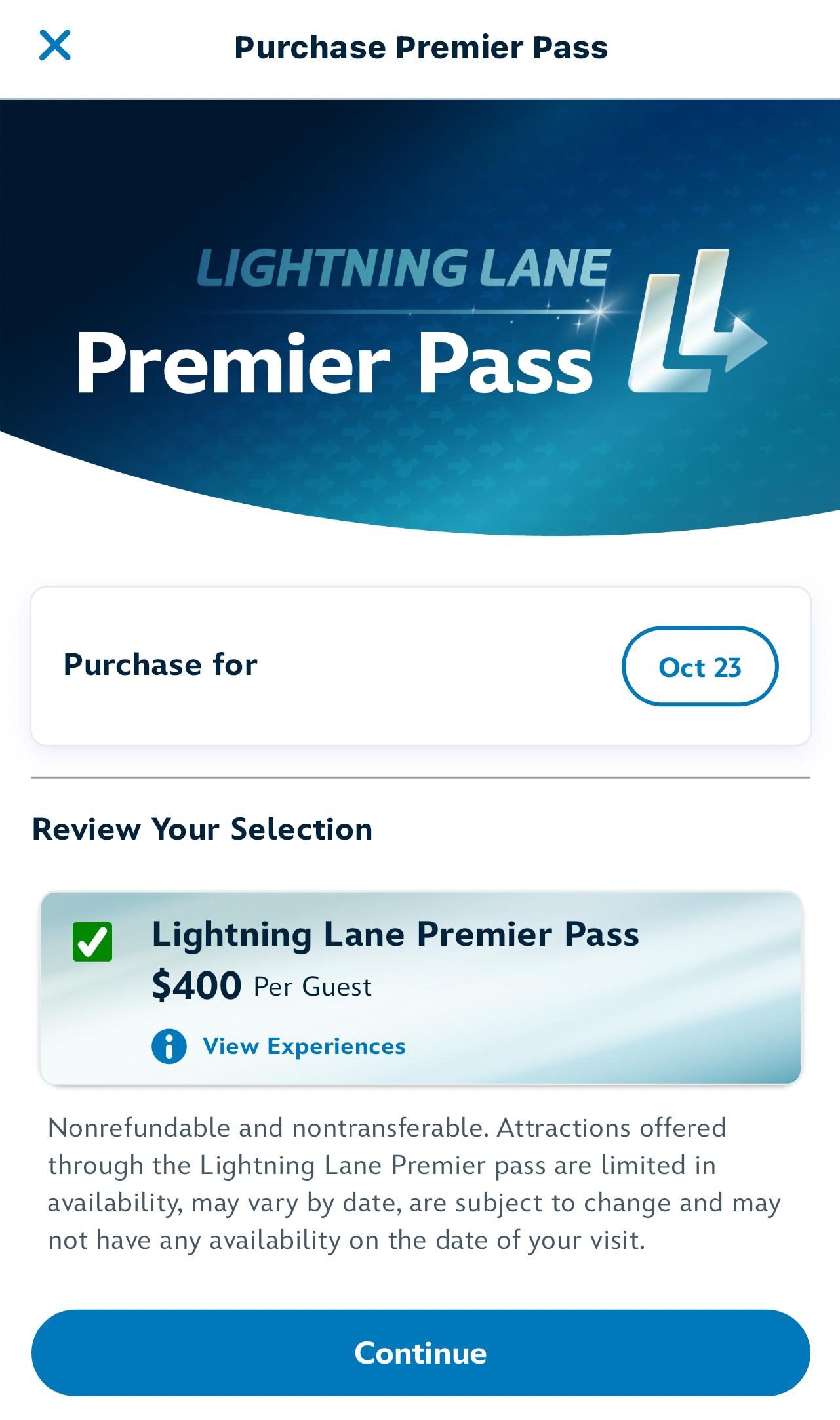 Once you pull it up, you’ll see the the option to purchase Premier Pass. Click on the “Purchase Lightning Lane Premier Pass” to continue.