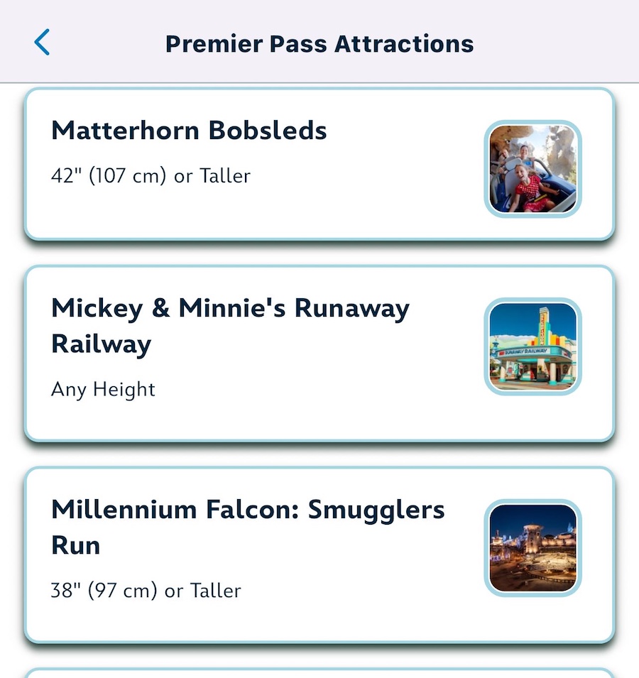 First, open the app and you’ll find the list of available Premier Pass attractions. (See all the inclusions in the next section on this page.) When you visit one of the eligible attractions, you’ll also select it within the app, as you see here with Millennium Falcon: Smugglers Run.