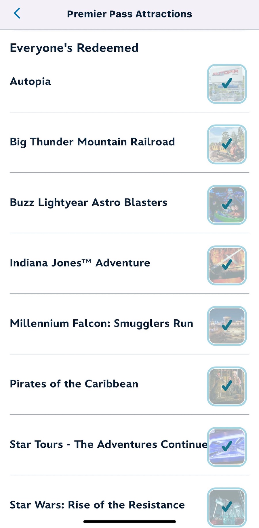 Following the ride, Smugglers Run is “Redeemed” and now unavailable to be selected a second time.