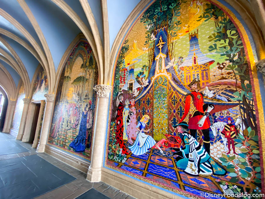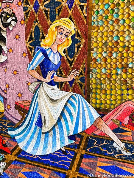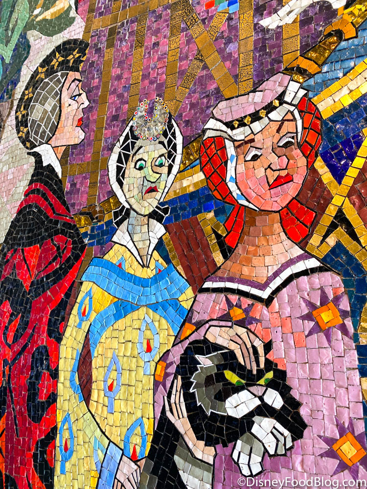 The gorgeous and colorful mosaics tell the story of Cinderella in truly stunning detail, beginning with her time with Lady Tremaine (Cinderella’s stepmother) and Anastasia and Drizella (her stepsisters).