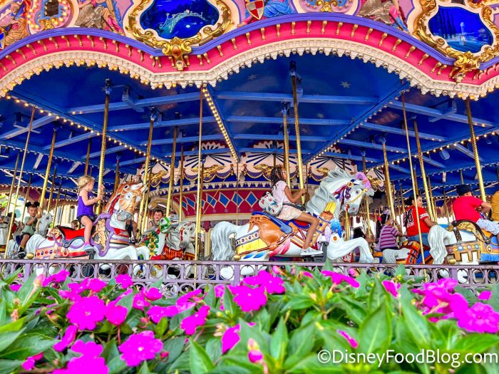 If you look from the direct center of Main Street, U.S.A., you can get a peek of it spinning in the distance just beyond Cinderella Castle… Prince Charming Regal Carrousel is a treasure of a merry-go-round featuring 90 horses — each beautifully and uniquely decorated — donning vibrant colors and garlands, all ready to carry royalty.