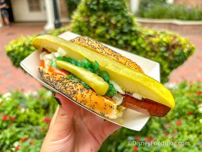 - Chicago-style All Beef Hot Dog with tomato, dill pickle, pickled sport pepper, diced onions, yellow mustard, and Chicago green relish in a poppy seed bun (New) — $6.75, Disney Dining Plan snack credit eligible