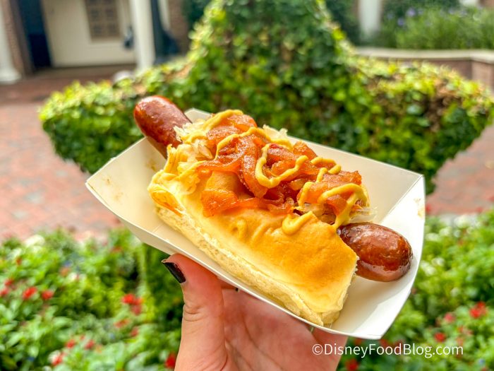 - New York-style All Beef Hot Dog with sauerkraut, onion-tomato sauce, and spicy mustard in a brioche bun (New) — $6.75, Disney Dining Plan snack credit eligible