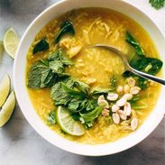 Chicken and rice soup with leafy herbs and a lime wedge.