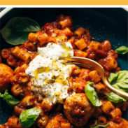 This whole combination is like a hug in food form: little boingy bites of pasta, tender meatballs, caramelizey tomato sauce (it almost browns a bit on the bottom of the IP). And things even get a tiny little bit blingy when you load it up with some herbed lemon ricotta which packs some fresh garlic in there, and everything else good in your pantry – salt, pepper, basil, olive oil – gets flashy up on top. Sweatpants, fork, deepest pasta bowl, let’s go.