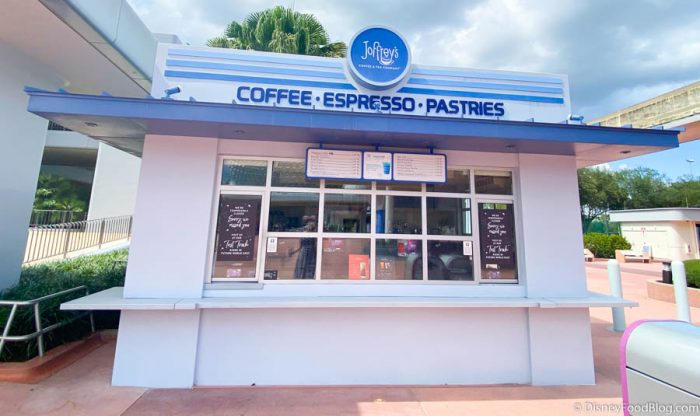 Guests heading to Magic Kingdom or EPCOT by way of the Transportation and Ticket Center (the TTC), can start their day with a cup of Joffrey’s coffee at a Joffrey’s kiosk standing between the entrances to the Monorail and the Ferryboat.