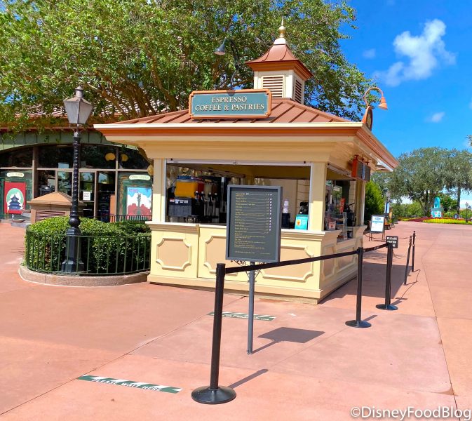 Guests can look forward to fresh-brewed coffee, as well as specialty espresso beverages including lattes, mochas, cappuccinos, and more… all served hot or iced. A selection of pastries and donuts is typically available, too. While the menus are uniform, for the most part, select kiosks may serve their own specialty drinks (such as the Mission to S’mores Latte at Joffrey’s Revive in Magic Kingdom), and all kiosks serve Seasonal Beverages with festive twists for the current season or holiday.