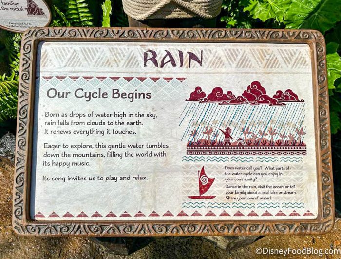 Disney Imagineer Zach Riddley explained that these signs and experiences “guide guests through the cycle of water in fun and engaging ways to tell our story of the vital link we share with water across our planet, and inspire the important role we all share in preserving this life-giving and life-sustaining precious resource.”