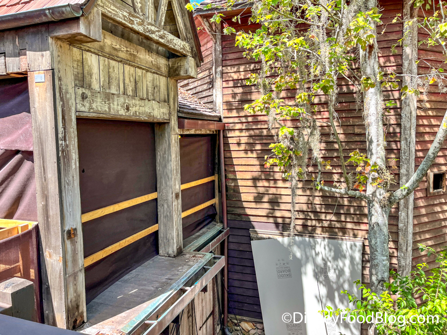 Over at Tiana’s Bayou Adventure, things are moving along in the queue for the ride. We saw construction workers moving materials in and out of the building.
