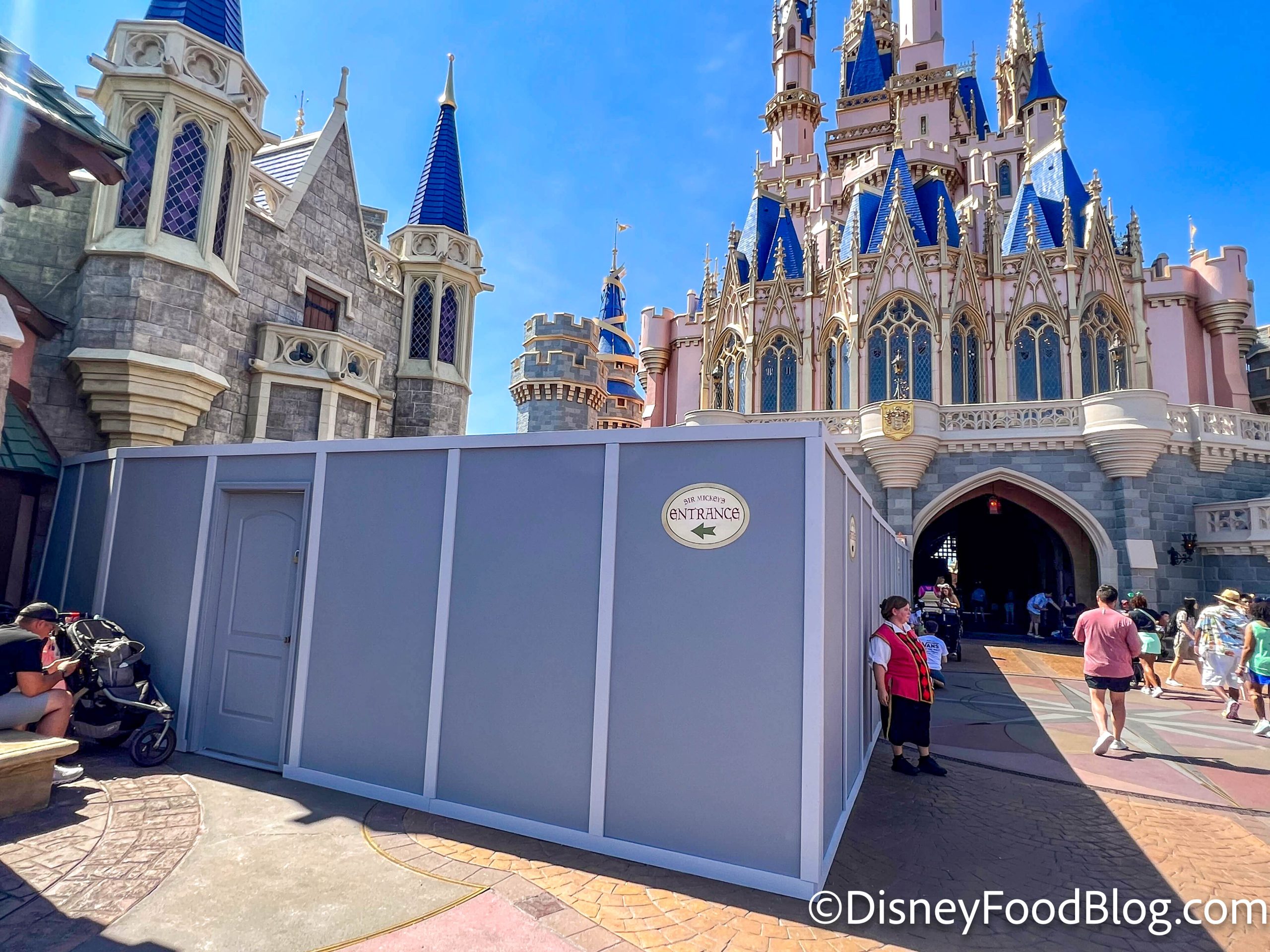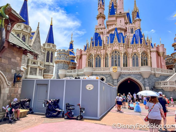 Disney is in the process of removing the 50th Anniversary decorations from Cinderella Castle, and on May 8th, we spotted a new wall that blocked off part of Sir Mickey’s and one of the castle’s side pathways.