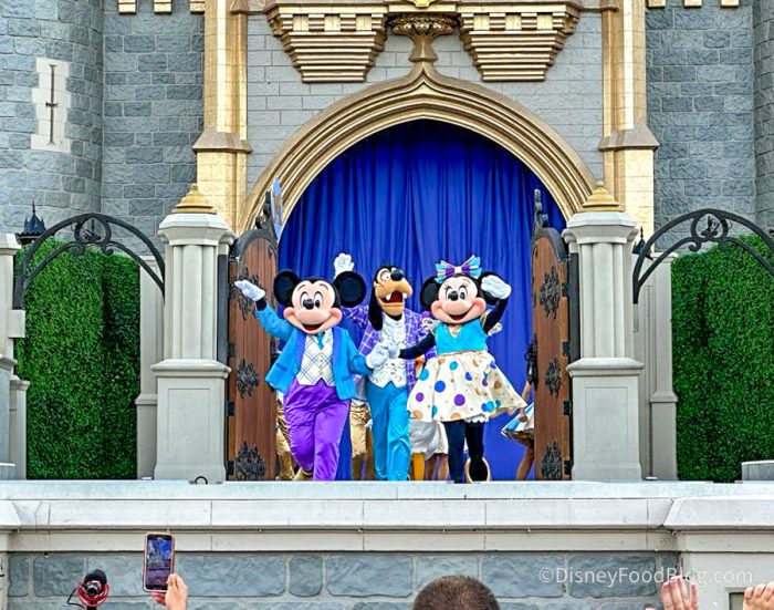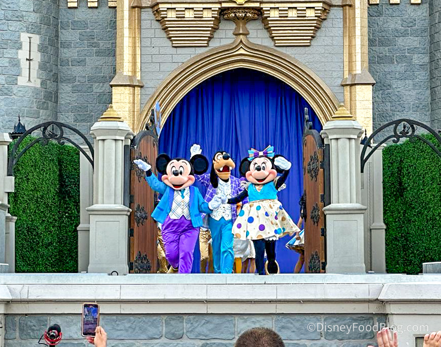 Disney characters — including Mickey! — kick of the day with music and magic at Cinderella Castle with Let the Magic Begin!