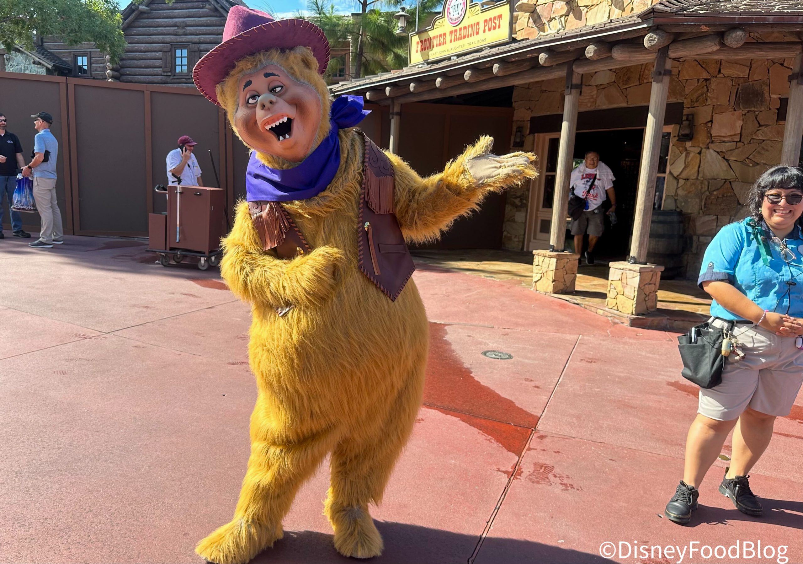 Throughout the day, you never know exactly who you’ll encounter! Be sure to check My Disney Experience and the Information Boards posted around the park for characters and their appearance times. As one example, you’ll often find several of those lovable Country Bears from the famous Country Bear Musical Jamboree hanging out in Frontierland, ready for a hug and a photo.