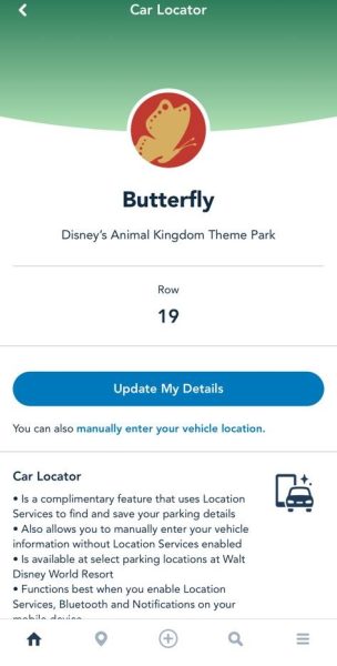 Simply open the My Disney Experience app and tap the car locator card on the home screen (or you can use the feature menu with this symbol “☰” for access). In order for the feature to work best, you will need to enable location services, bluetooth, and notifications on your phone.