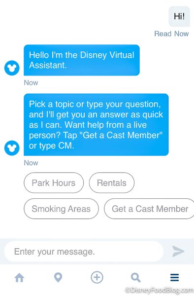Disney World offers a “virtual assistant” feature within the Disney app chat function (under “Chat With Us”).