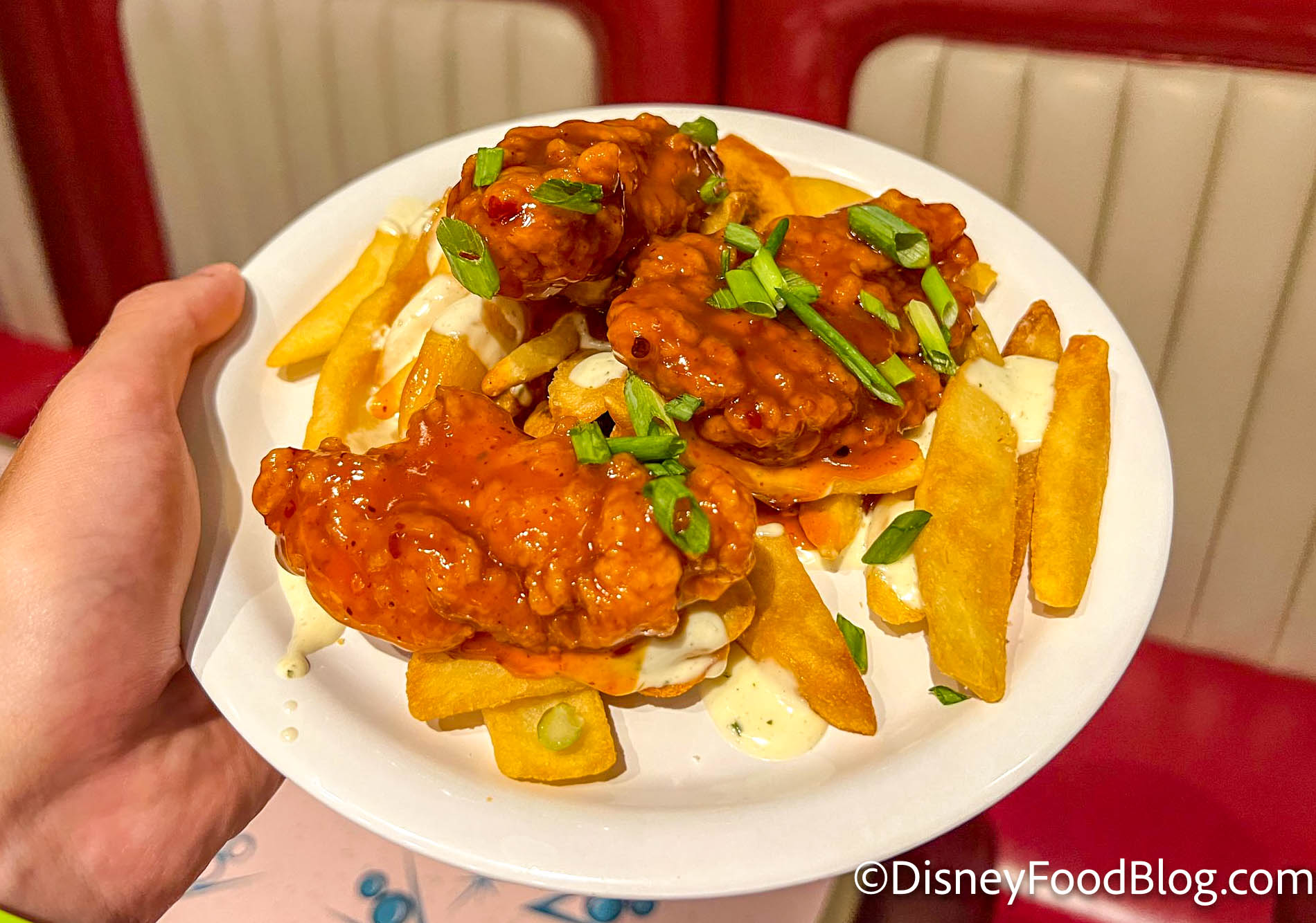 - Loaded Buffalo Chicken Fries at Flo’s V8 Café — Steak Fries topped with Blue Cheese and Chicken Tenders tossed in Buffalo Sauce, with Celery Bits and a drizzle of Ranch Dressing; $14.99