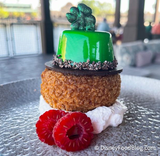 If you’re in search of an elegant St. Patrick’s Day dessert in Disney World, head over to Disney’s Coronado Springs Resort. There, you can find the St. Patrick’s Dessert: an Irish cream mousse-filled pâte à choux with pistachio cream and a chocolate shamrock. Fancy words aside, just look at how CUTE this dessert is! It’s wearing a little hat! ($10.00 March 17th – 20th at Dahlia Lounge and Three Bridges Bar and Grill)