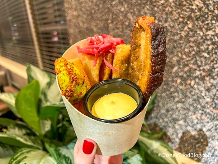 Fried pork belly, yuca fries, red pickled onions, and chili-lime seasoning with a yellow pepper aïoli make up this unique handheld snack.