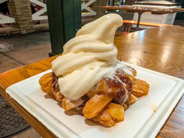 Mini churros are topped with vanilla soft-serve, spiced apples, and spiced chocolate sauce.
