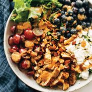 Thanks for this wonderful recipe! We grilled instead of cooked chicken on stovetop (as I do not trust myself cooking chicken on stovetop – I either over/undercook). Also, I used 3T OJ, 1T water and 2T oil in the dressing to increase orange flavor. We only used grapes, as we did not have available blueberries. Still, a nice complement of flavors/textures.