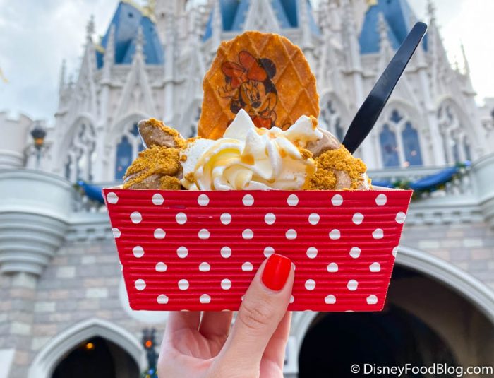 This delicious treat features gingerbread soft serve topped with a sprinkle of gingerbread pieces, whipped cream, and a Minnie Mouse waffle topper (which is too stinking cute!). Available for $6.49 at Storybook Treats