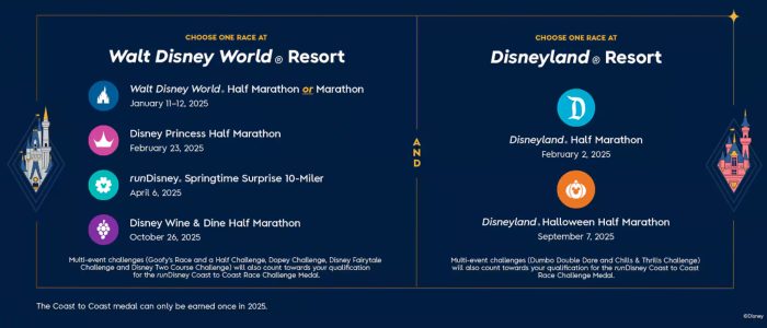 The runDisney Coast to Coast Challenge is BACK! Here’s how it works: If you complete any runDisney race of 10 miles or more at BOTH Disney World and Disneyland in the same calendar year, you’ll get a special Coast to Coast Race Challenge Medal!