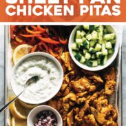 Sheet Pan Chicken Pitas that are salty-briney-crunchy in all the right ways! Marinated chicken, roasted peppers, fresh cucumber, kalamata olives, feta cheese, and an easy homemade tzatziki.