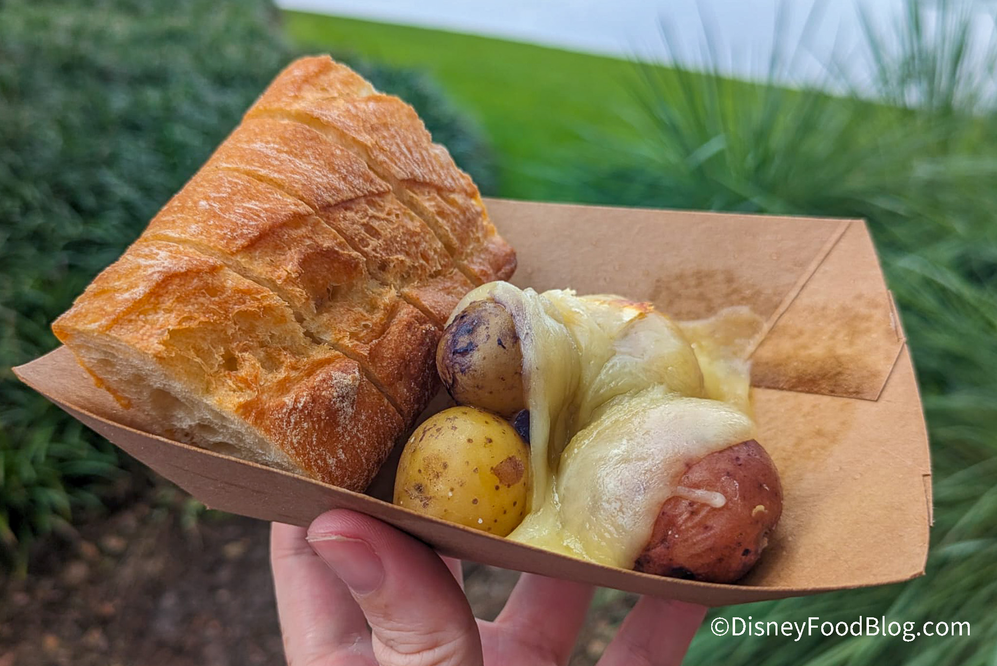 - Warm Raclette Swiss Cheese with baby potatoes, cornichons, and baguette — Emile’s Fromage Montage item — $5.25, Disney Dining Plan snack credit eligible