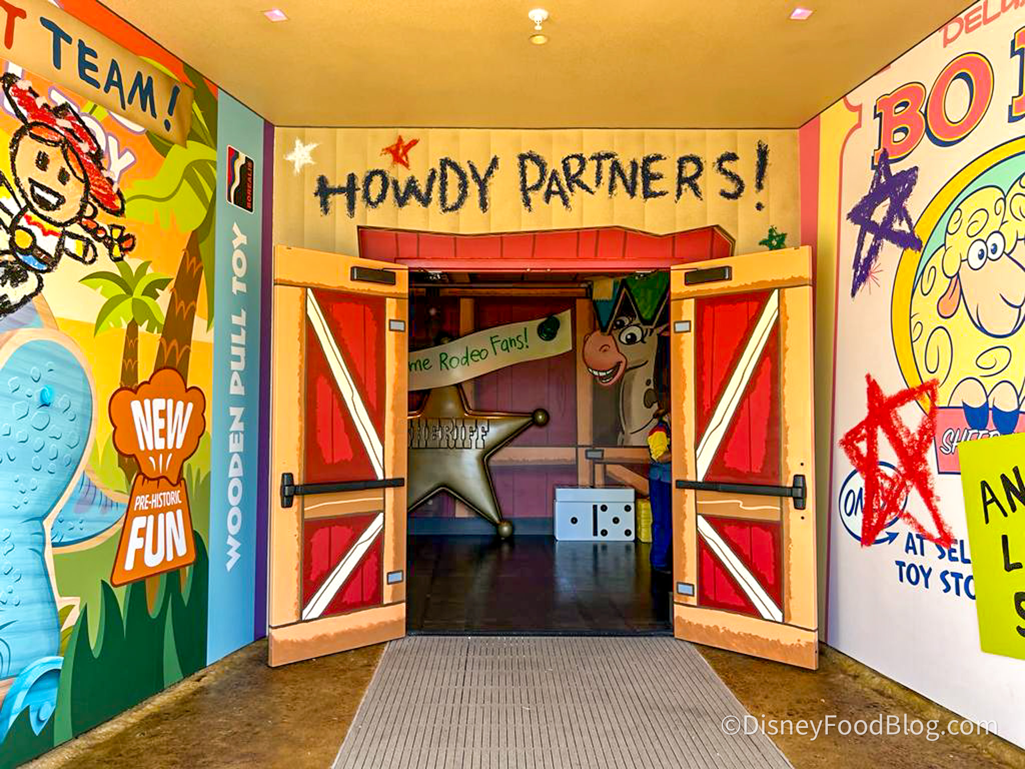 Roundup Rodeo BBQ takes guests on a rootin’ tootin’ dining experience in a new play area: a RODEO arena, created by Andy himself! Andy has taken some of his favorite games and play sets to create the scene with both western toys and other items (like blocks, lights, cardboard cut-outs, and more) coming together to make a bright and colorful mash-up atmosphere. (In fact, you may even experience an “Andy’s Coming” moment!)