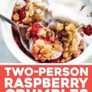 The BEST easy summer dessert – for two! A layer of oat-brown-sugar crust, juicy, sticky, bubbly raspberries, and topped with a buttery crumble that’s baked to perfection. YUM.