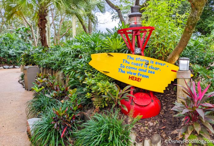 You’ll discover the story behind Typhoon Lagoon presented in a series of signs as you drive (or ride, by Disney bus transportation) towards the parking lot and bus stops: “A furious storm once roared ‘cross the sea, catching ships in its path, helpless to flee. Instead of a certain and watery doom, the winds swept them here to Typhoon Lagoon.”