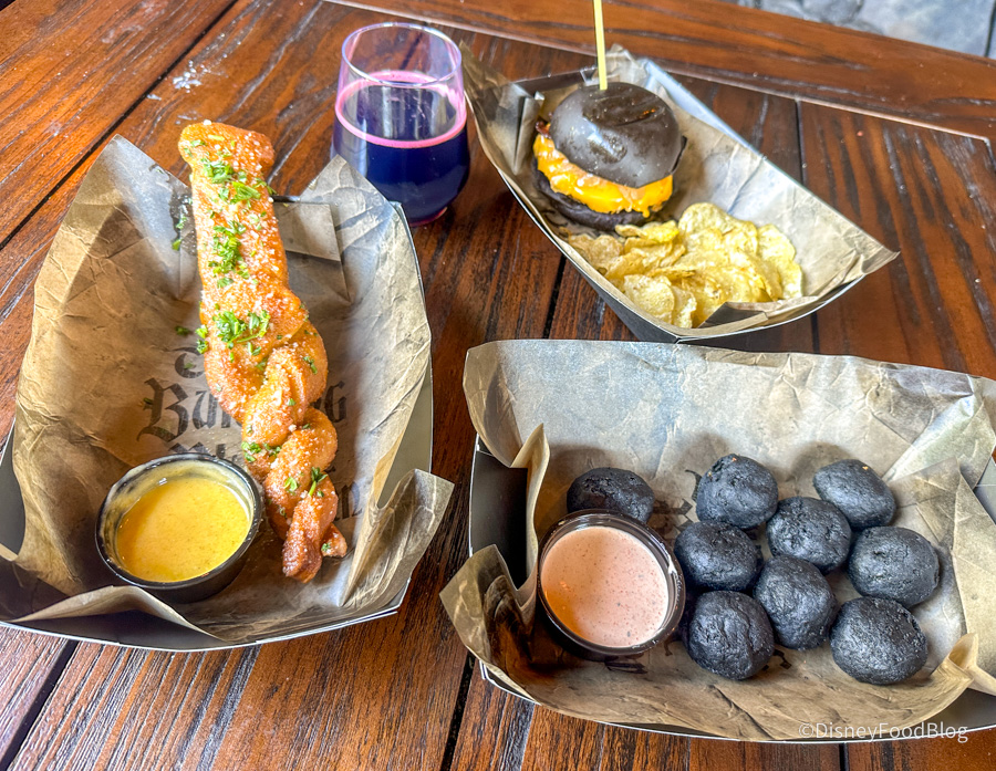 Along with Butterbeer, American cocktails — including Fleur 75, the Lobe Blaster (pictured), Philosopher’s Old Fashioned, Sherbert Lemon, and Gigglewater — and a variety of beers and wines are featured on the menu at this little hideaway. Non-alcoholic drinks are also on offer, including the famous Pumpkin Juice and a magical glittering tea!