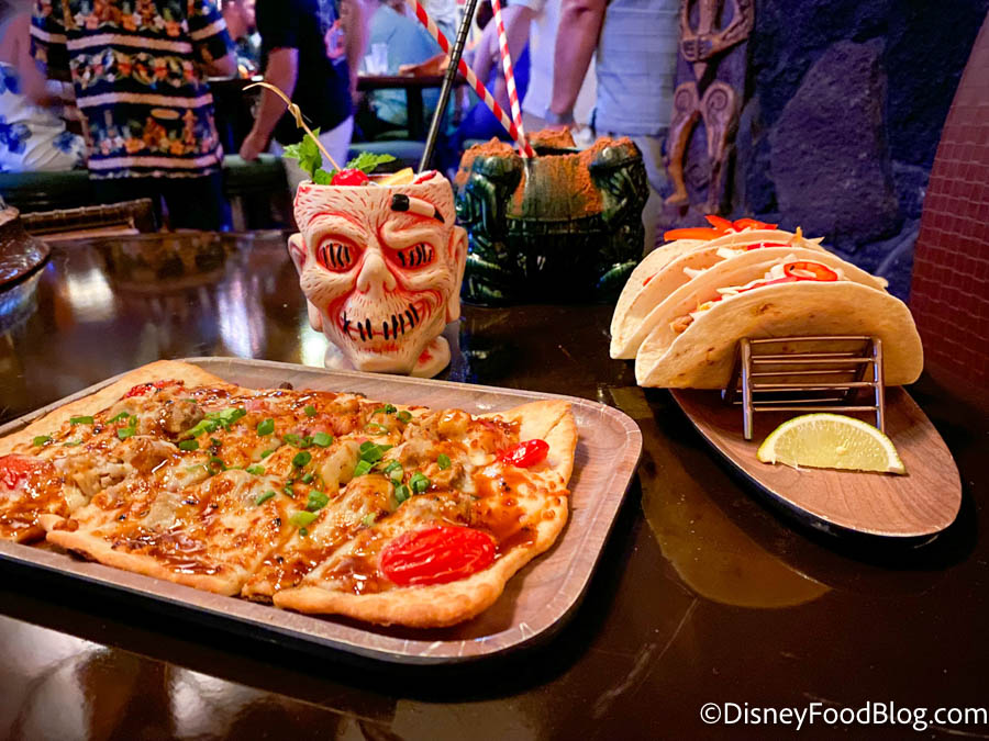 Disney details abound all over Trader Sam’s Grog Grotto — a 51-seat bar which also features interactive elements from special effects throughout the room and zany antics from the bartenders in response to the ordering of certain libations (many of which are served in highly collectible souvenir tiki glasses)!