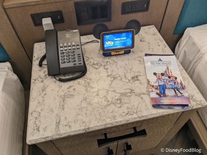 In between the beds is a nightstand with plugs for your chargers and the Hey Disney digital assistant! There’s also more storage underneath.